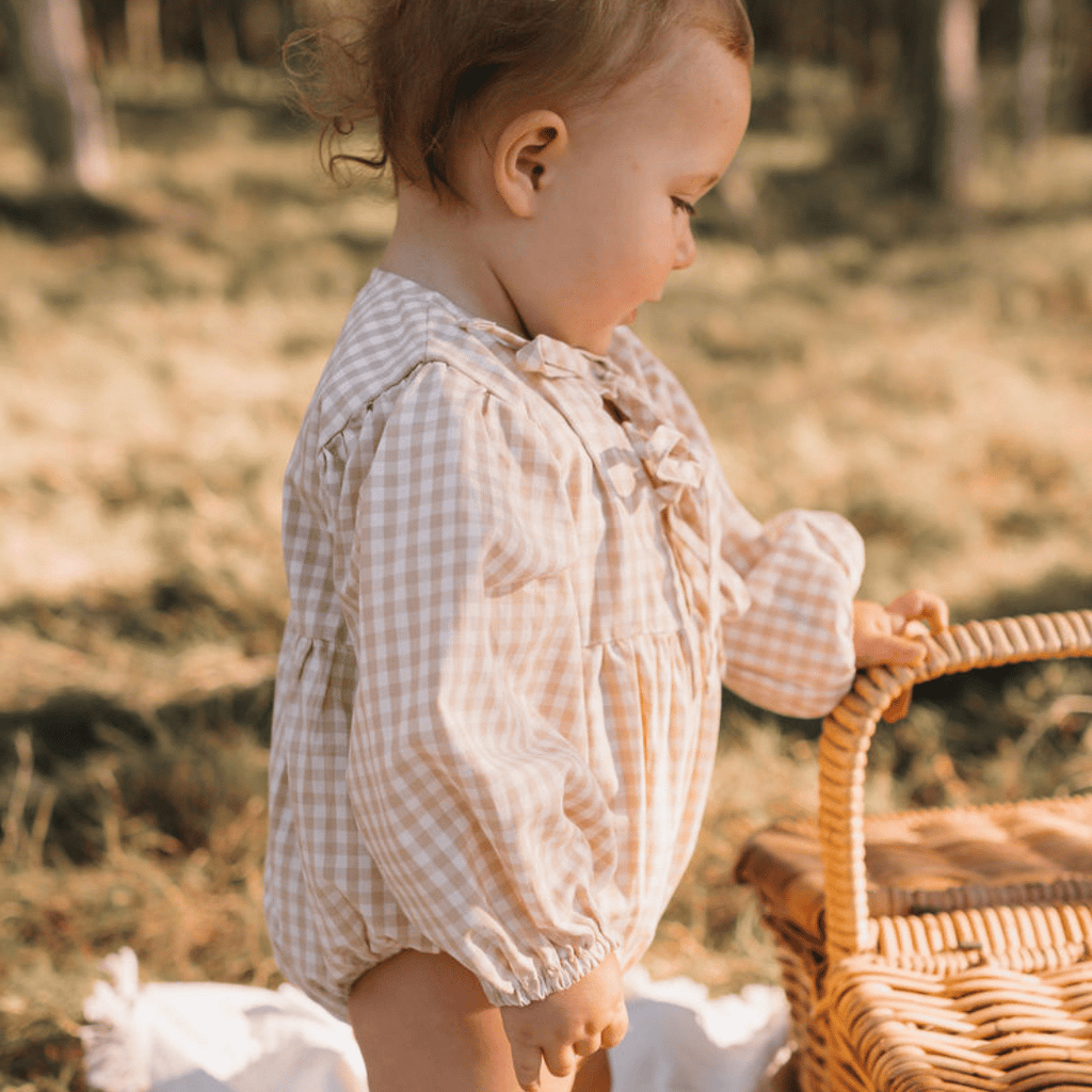 Timeless and enchanting ~ our lightweight soft oat gingham, adorned with two tie-up bows, makes this romper a wardrobe classic.