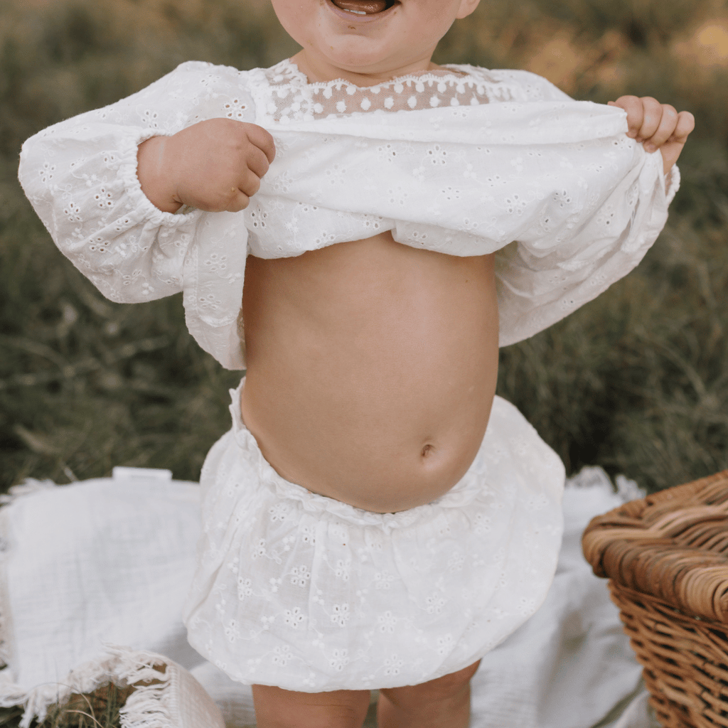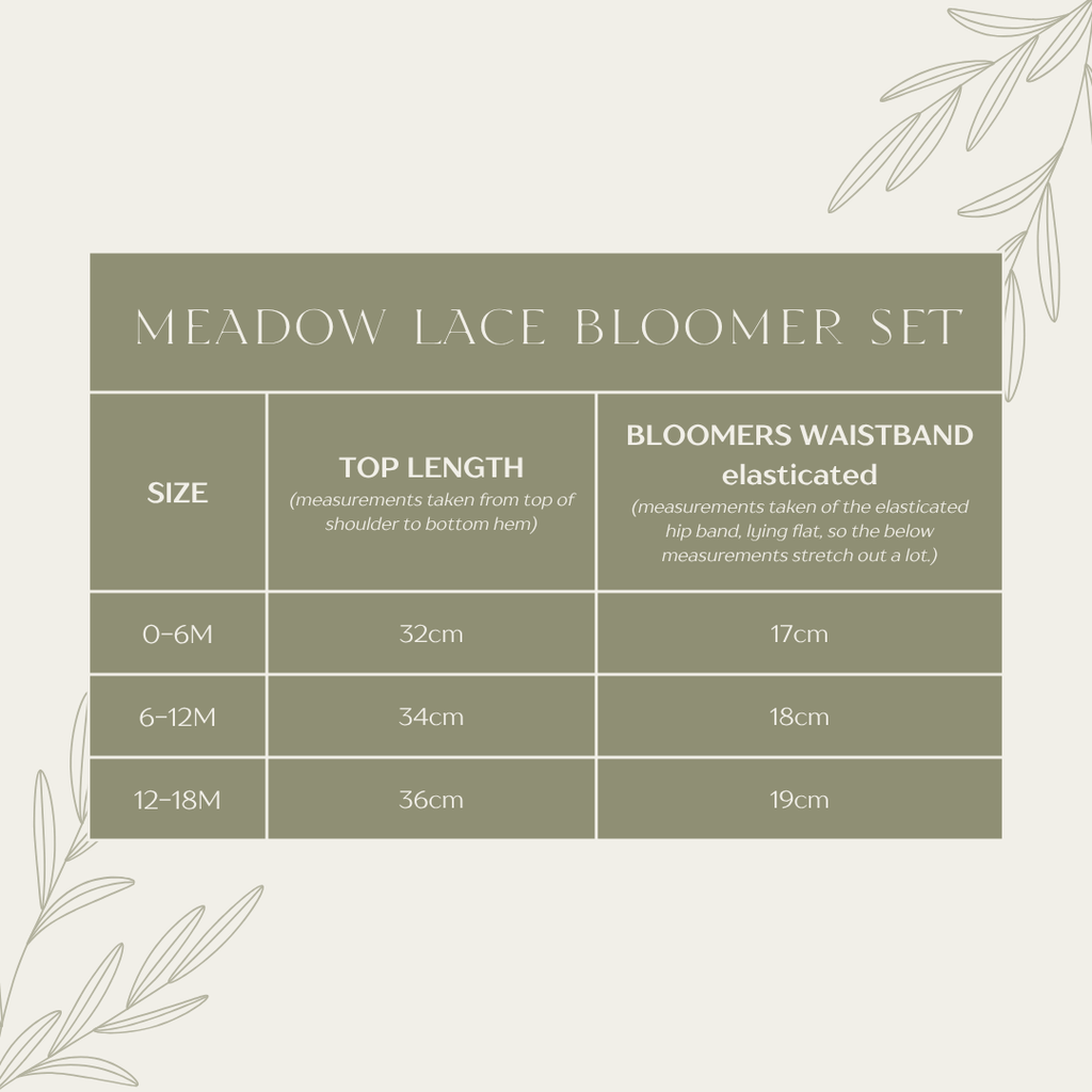 Ohh Meadow Lace ~ so delicately timeless, charming & elegant. Our 2-piece Bloomer Set includes a gorgeous top & sweet bloomers for the younger darlings. Embroidered cotton & lace with delicate trims and unique square neckline. Perfect for special occasions, photoshoots or just everyday moments.