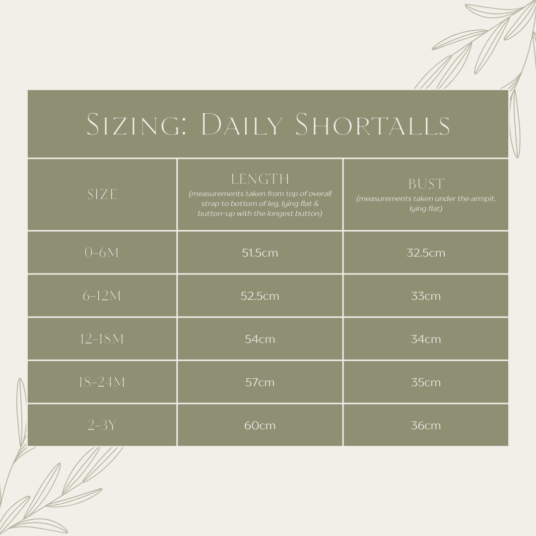 The daily Shortalls ~ the easy outfit for a stylish darling! A nice light-weight 100% cotton to keep them cool in summer and take it through to Autumn with a long-sleeve top underneath too. Looking for the perfect tee for underneath, have a peek at our Daily Tee!
