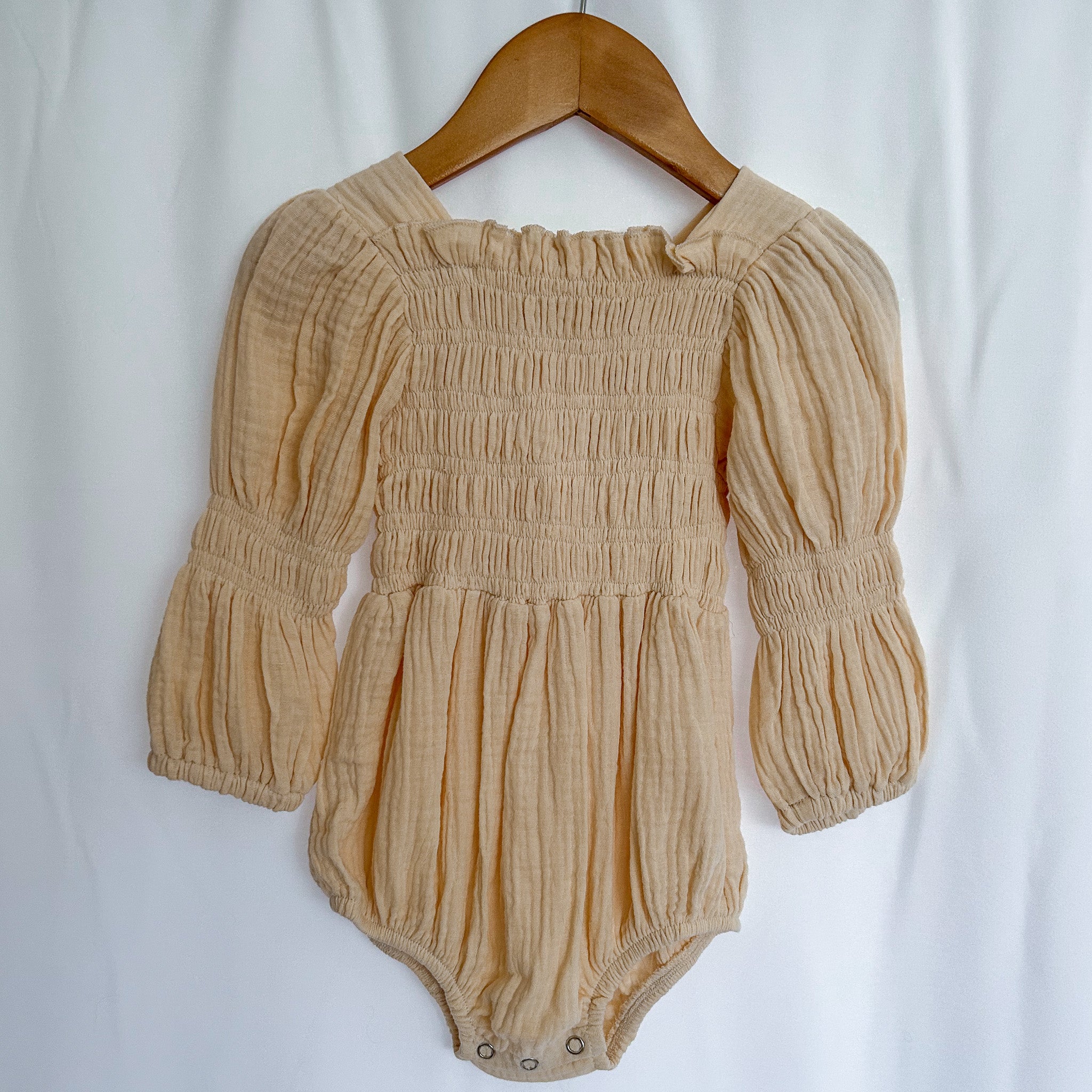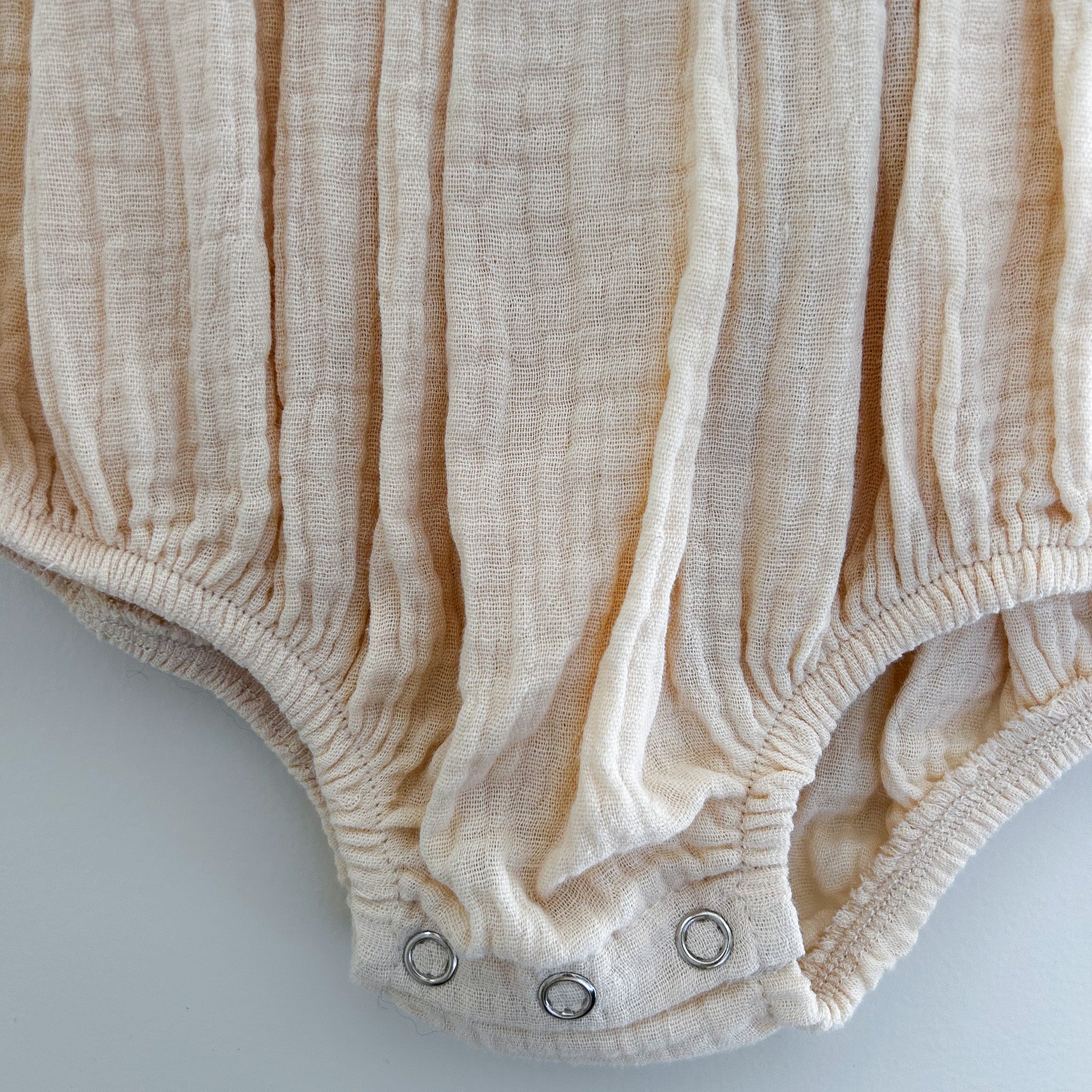 The Willa Romper is a beautifully crafted baby and toddler essential, made from soft, breathable 100% cotton double gauze. Inspired by vintage charm, it features a gently smocked bodice for comfort and stretch, paired with romantic puff sleeves that add delicate style without sacrificing practicality.