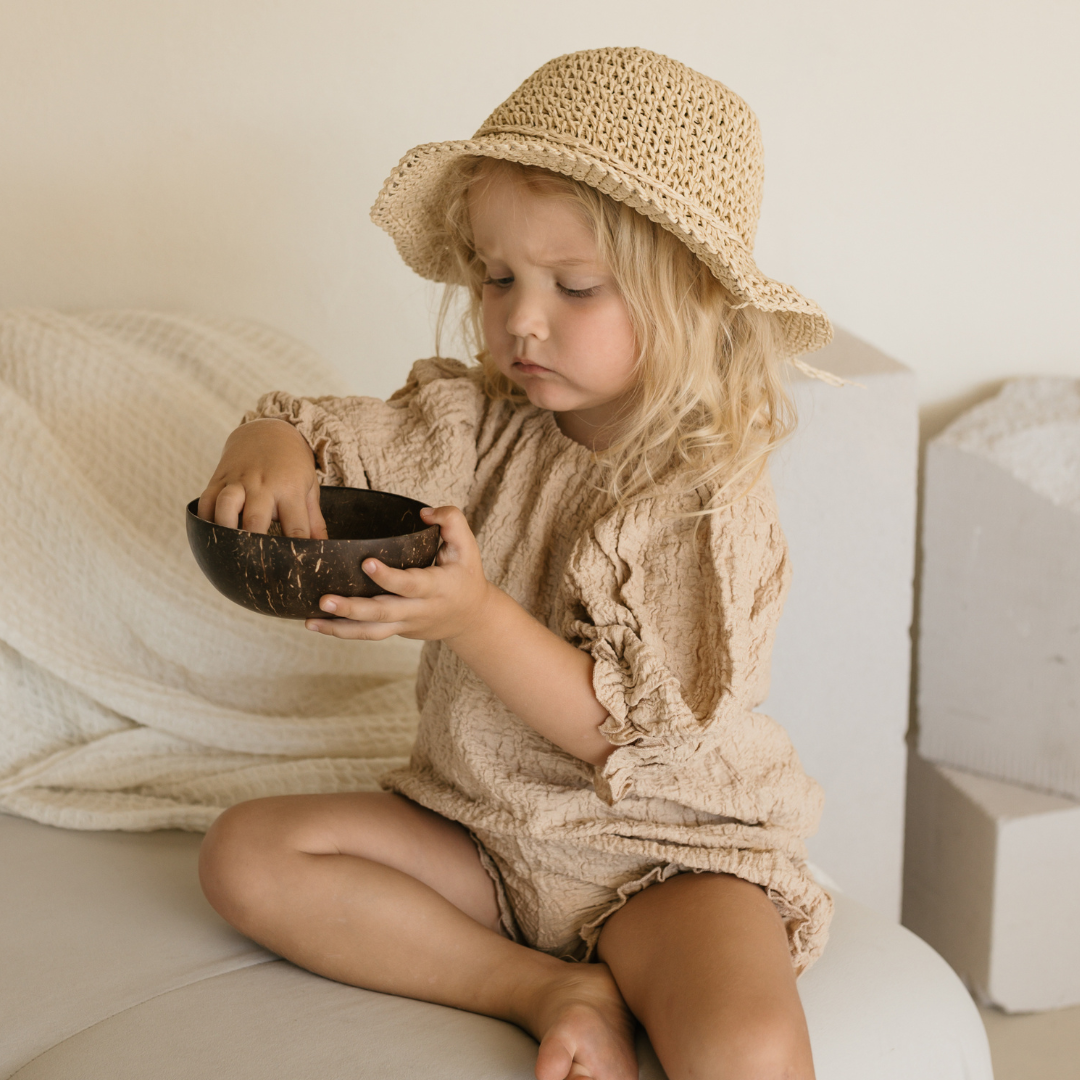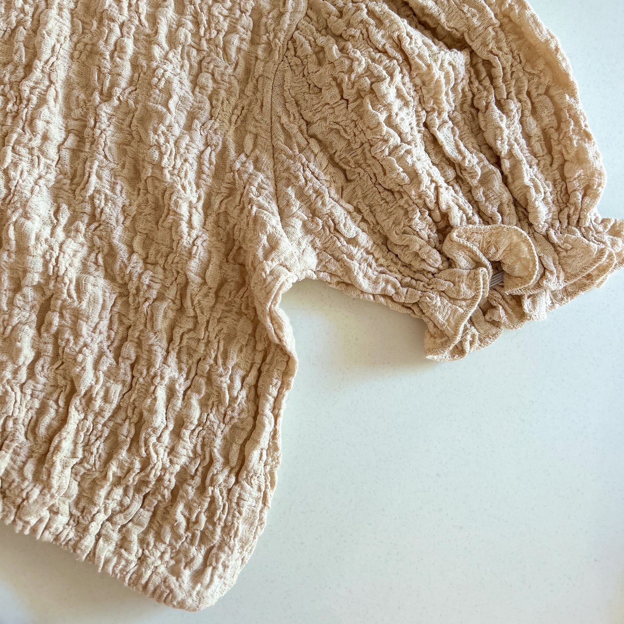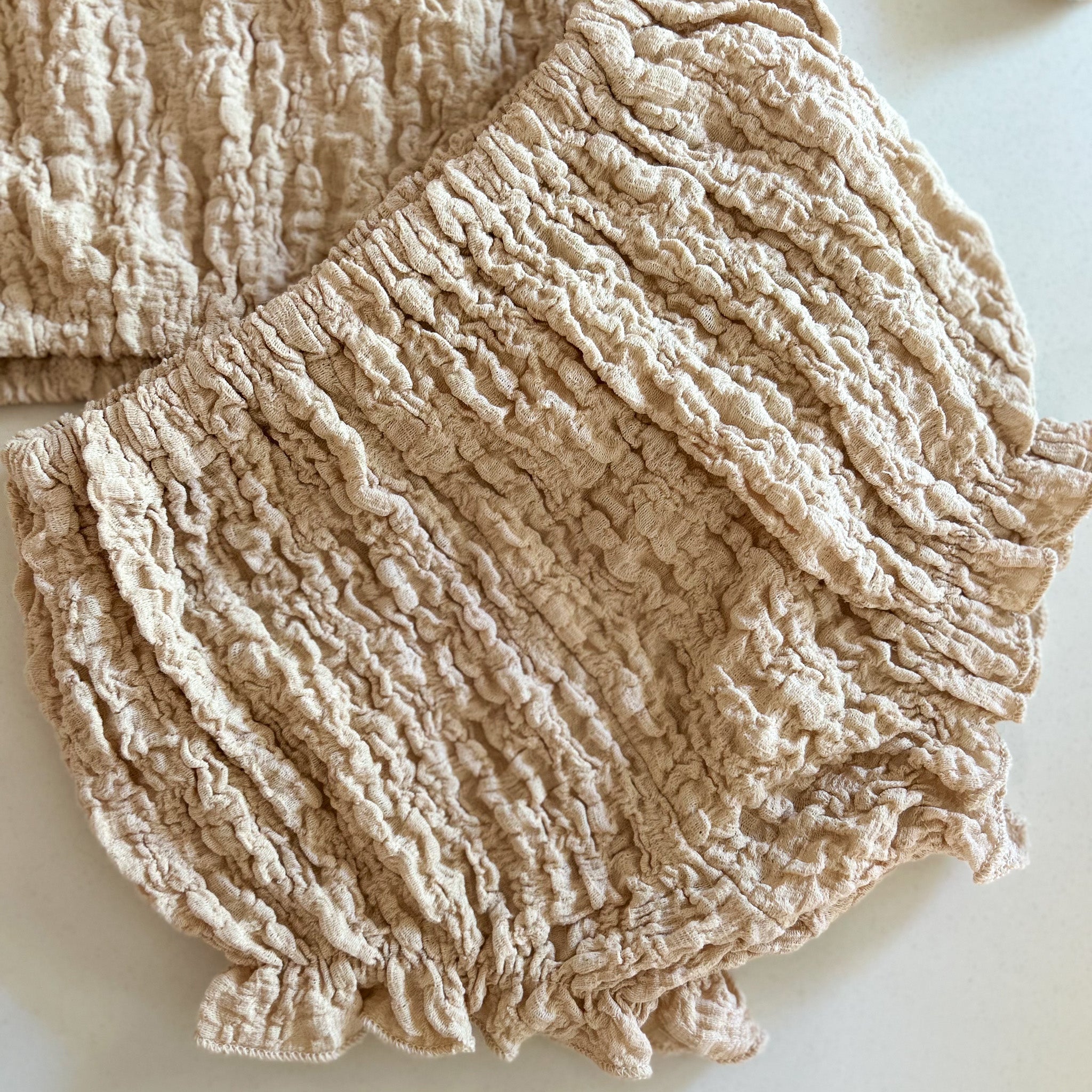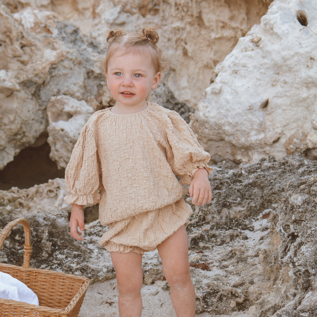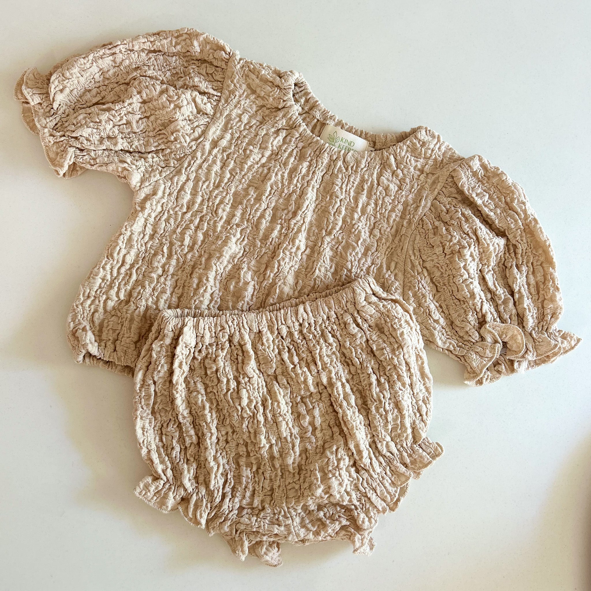 Our Signature 2-Piece Set is a Kind Keeper favourite. Loved for its soft crinkle texture, beautiful fit and effortless charm. Made from our luxe bronze cotton, this outfit includes a puff sleeve top with a flexible elastic neckline and hem, and matching bloomer bottoms with a subtle frill.
